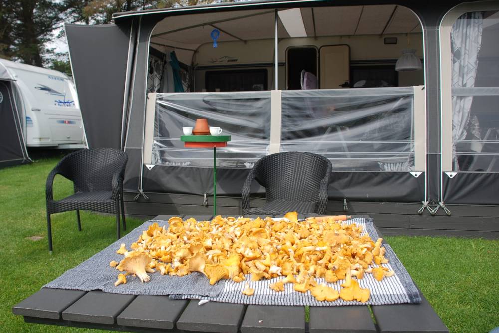 Hier auf dem Platz schätzen viele Menschen den grossartigen Schätz der Natur und die köstlichen Nahrungsmittel, die der Waldboden bieten. Von Juli bis Oktober passiert man häufig Wohnwagen und Zelte mit körben voller frisch gepflückter Pilze oder Camper, de gerade gefundene Pfifferlinge putzen und bürsten.